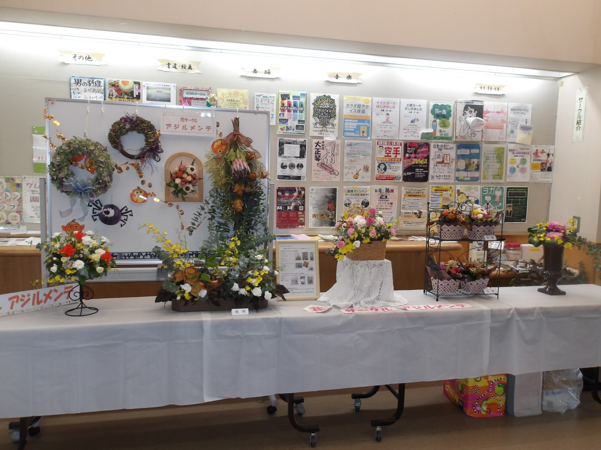 各サークルさんの展示発表(アイヌ刺繍、パッチワーク、つるし雛、書道、水彩画、折り紙、編み物、フラワーアレンジなど)と