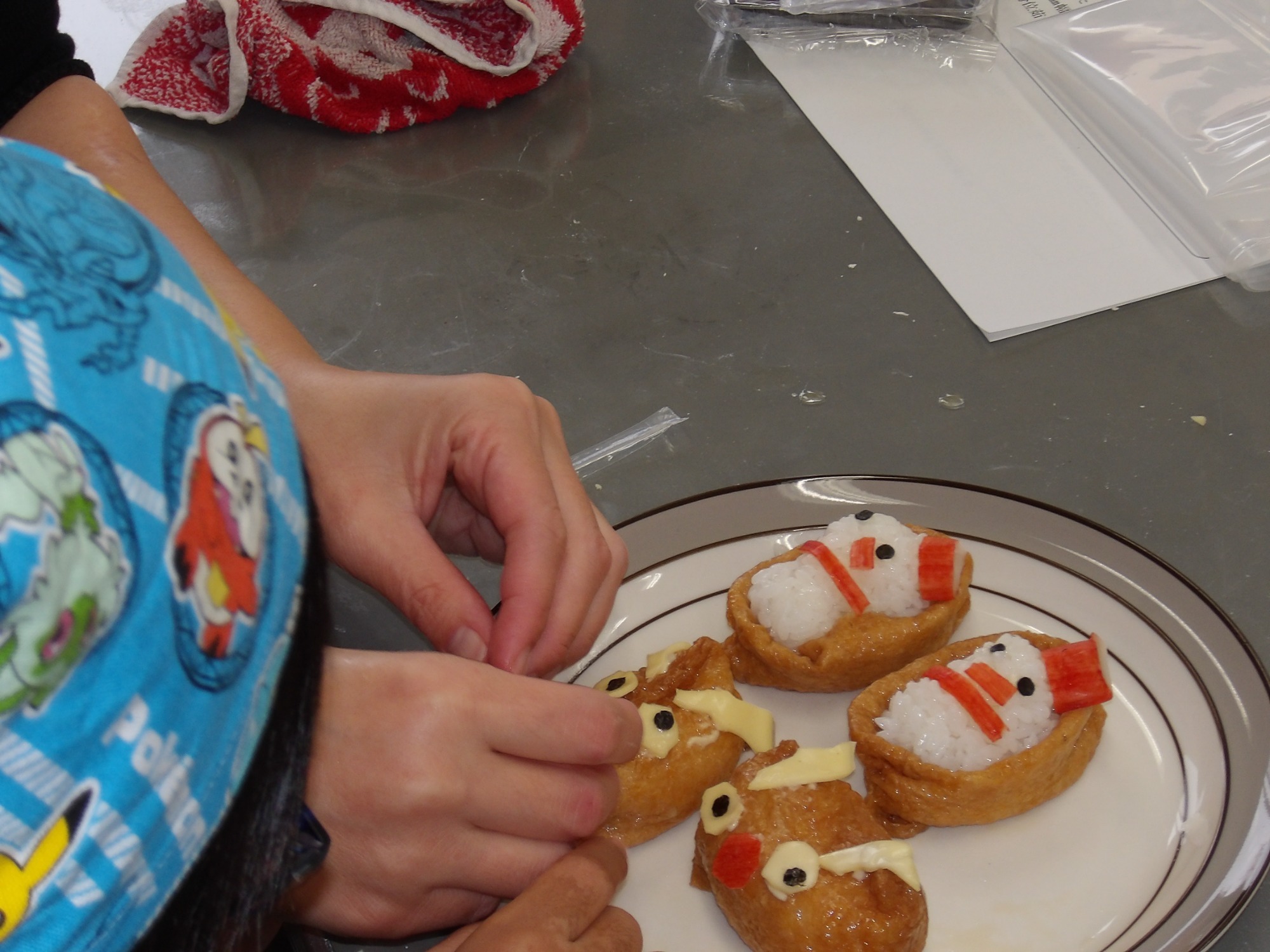 の工程全てを子ども達が頑張っていました!ねかせている間は、可愛い雪だるまいなり&トナカイいなりを作りました。